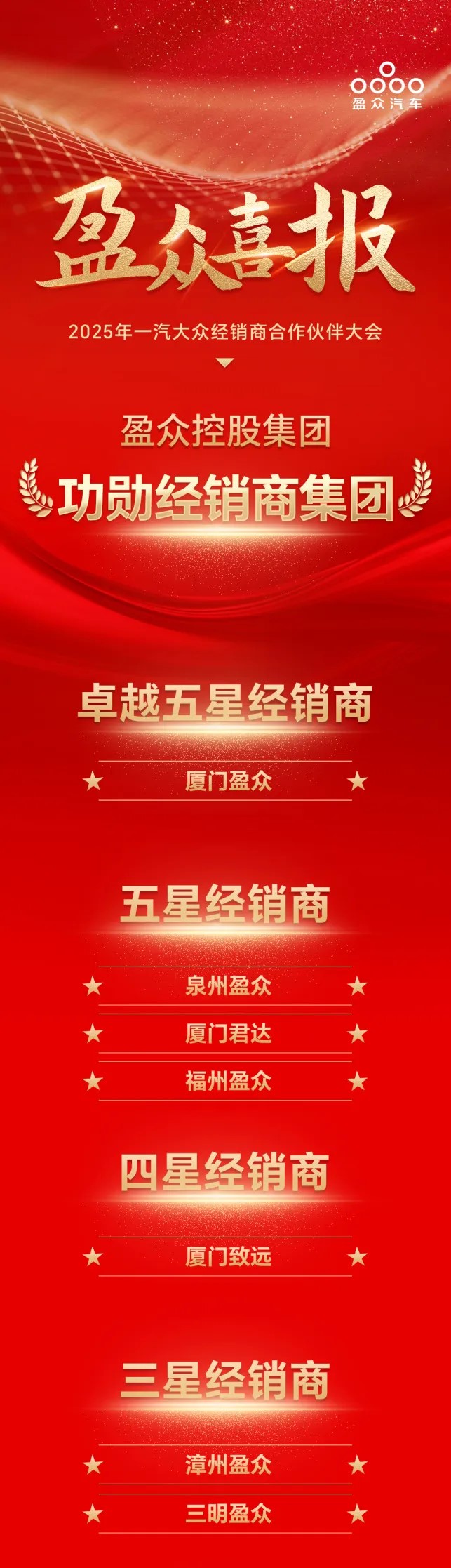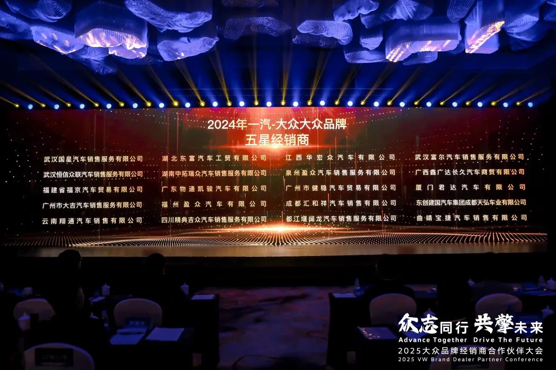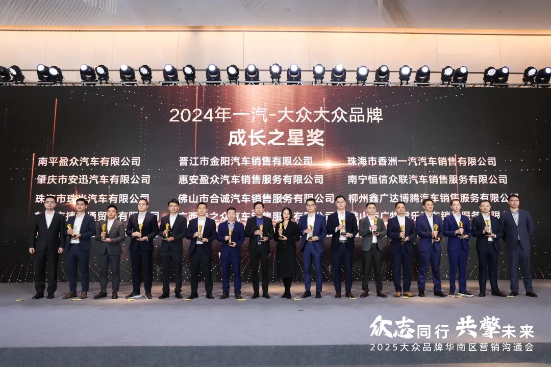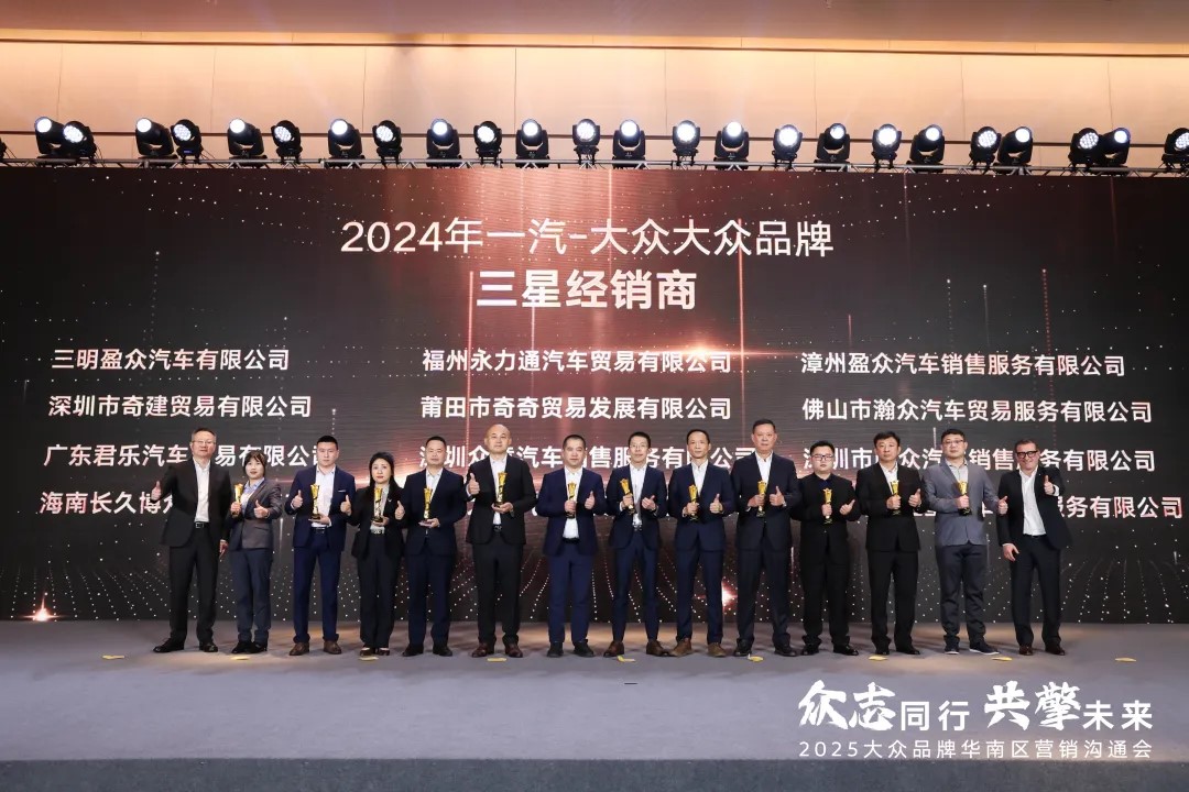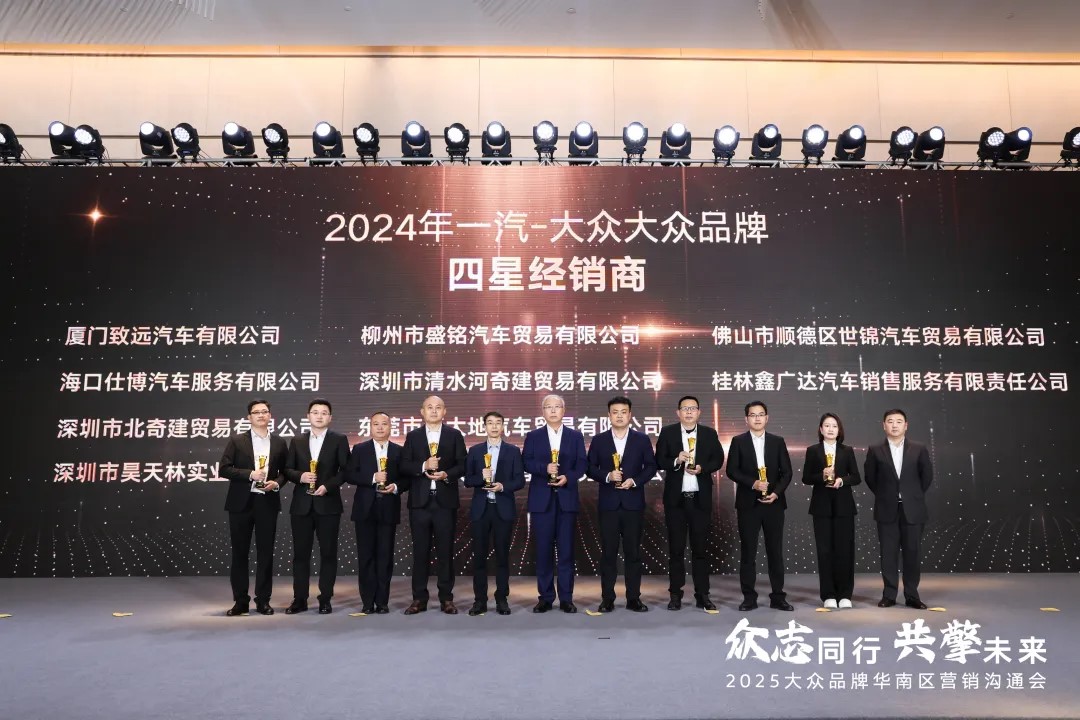 近日,2025大眾品牌經銷商合作伙伴大會、一汽-大眾華南區經銷商年會相繼召開,2024年度一汽-大眾優秀經銷商名單及個人獲獎名單新鮮出爐。盈眾一汽-大眾團隊憑借過硬的綜合實力及銷售業績、運營管理、客戶服務體驗等多維度的亮眼表現,榮獲“功勛經銷商集團”“卓越五星經銷商”“五星經銷商”“王牌總經理”等系列獎項。