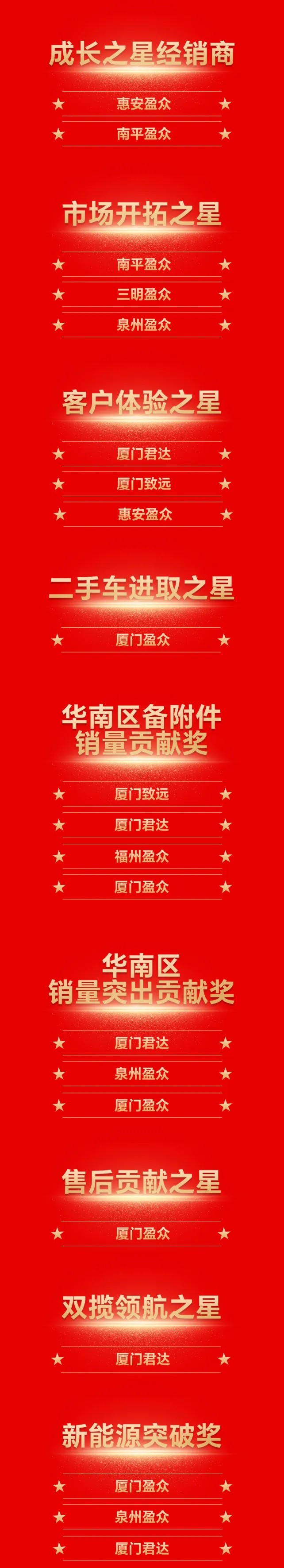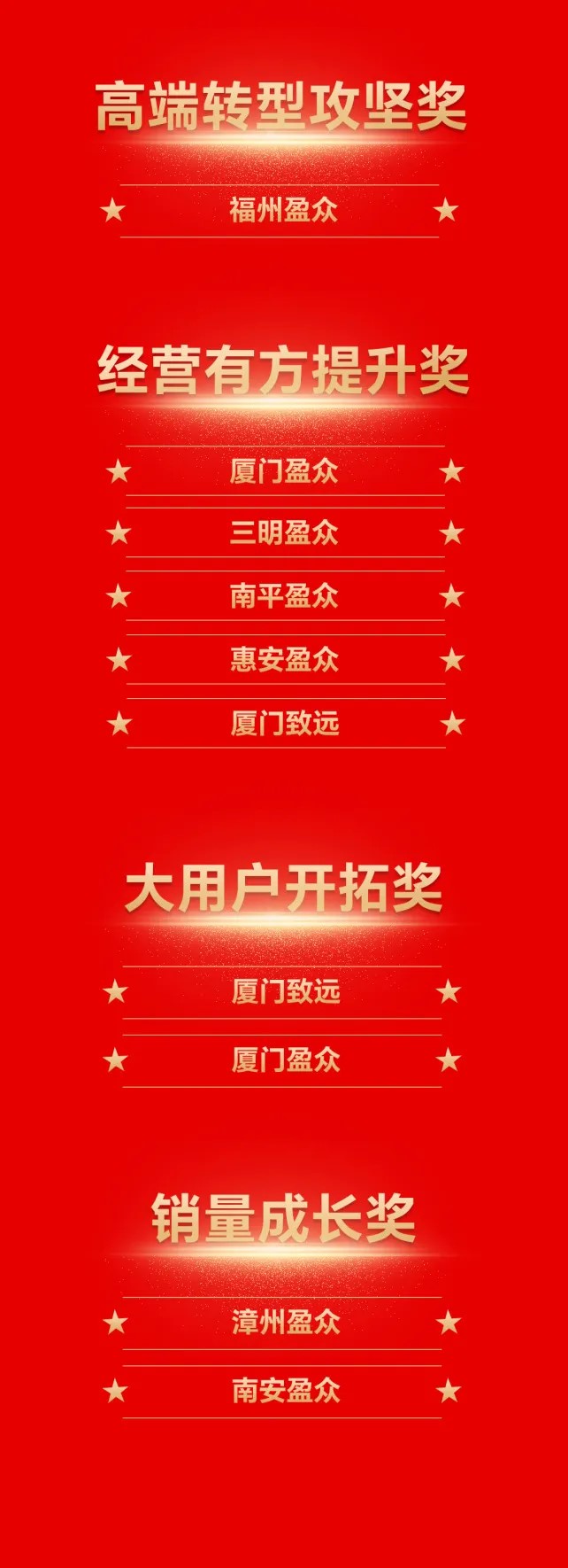作為一汽-大眾標桿經銷商,廈門盈眾已連續16年獲得“五星經銷商”榮譽稱號,今年,廈門盈眾更是成為華南區首家獲得“卓越5星經銷商”的4S店。泉州盈眾、廈門君達、福州盈眾2024年持續發力、多點突破,入選“五星經銷商”。廈門致遠秉持初心,腳踏實地,獲得“四星經銷商”,漳州盈眾、三明盈眾也憑借不懈努力,入選“三星經銷商”,惠安盈眾、南平盈眾獲得“成長之星經銷商”。