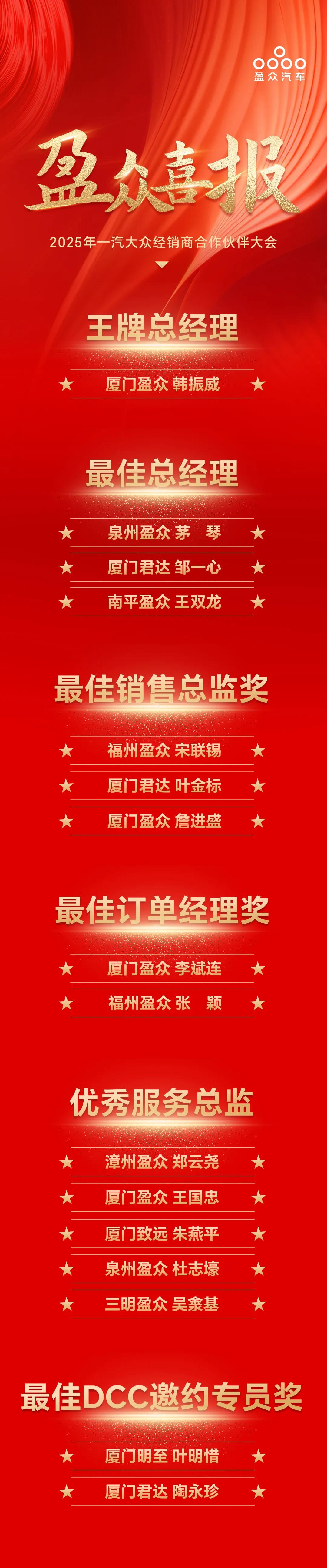 喜報 | 盈眾榮獲2024年度一汽-大眾功勛經銷商集團、卓越五星經銷商、五星經銷商、王牌總經理等多項大獎