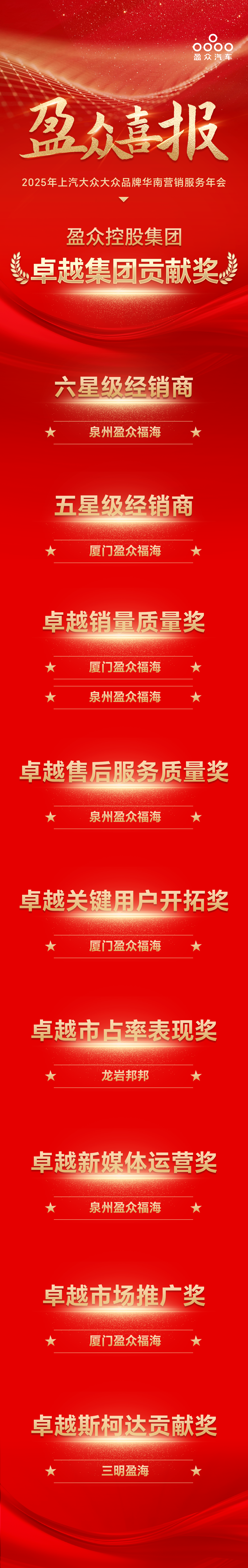 載譽而歸,碩果累累。每一份榮譽都凝聚著廣大客戶、合作伙伴的信任與支持,也見證了盈眾多年來深耕上汽大眾品牌的決心與積淀。在 2025 年新的征程中,盈眾將以此為新的起點,把榮譽轉化為前進的動力。秉持“用科技和文化,讓人們的汽車生活更美好” 的使命,不斷創(chuàng)新服務模式,提升服務品質,為客戶打造更加便捷、舒適、智能的汽車生活體驗,持續(xù)為上汽大眾品牌的發(fā)展貢獻力量,攜手共創(chuàng)更加輝煌的未來。