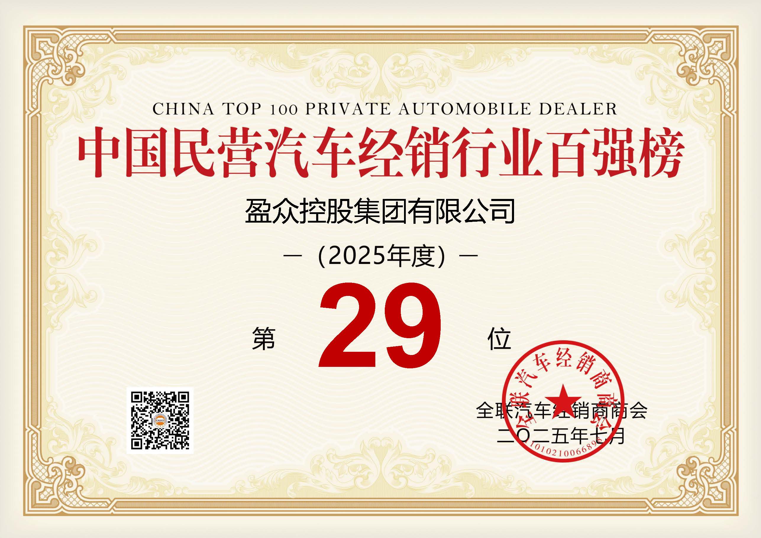 盈眾控股集團憑借各項綜合實力,繼續入選“中國民營汽車流通行業百強榜”,位列第29位。